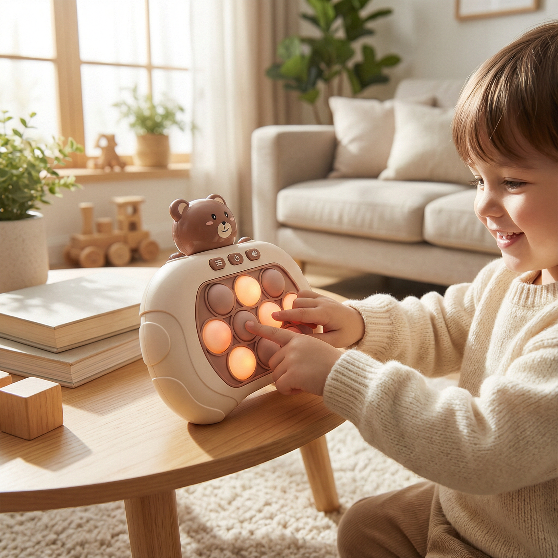 The game offers many play modes, allowing the child to practice reaction speed, memory and hand–eye coordination. There is also a two-player mode that encourages shared play and healthy competition. Illuminated buttons guide the child through the game's stages, and the task is to press them as quickly and as accurately as possible.